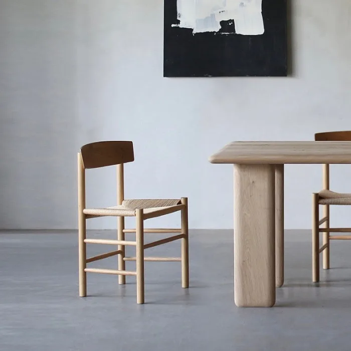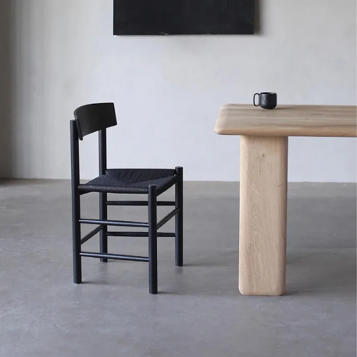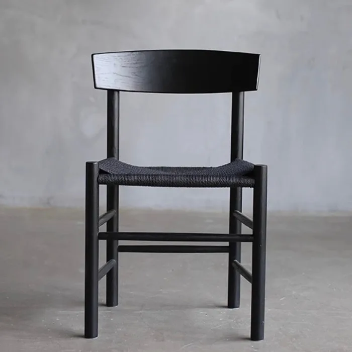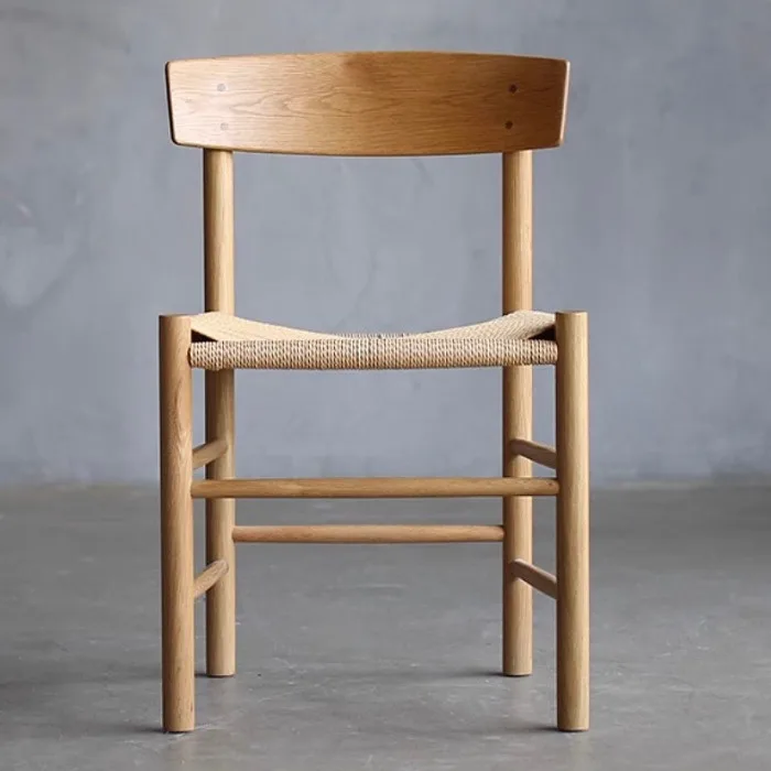 This is a minimalist, handcrafted wooden chair featuring a natural oak finish and a woven cord seat for added texture and comfort. The backrest has a gently curved design for ergonomic support, while the sturdy frame and clean lines create a timeless aesthetic. Perfect for dining areas, study rooms, or as an accent piece, this chair blends functionality with Scandinavian-inspired style.