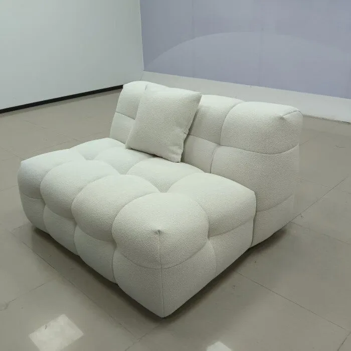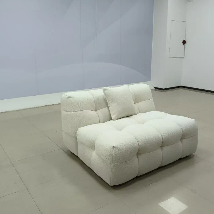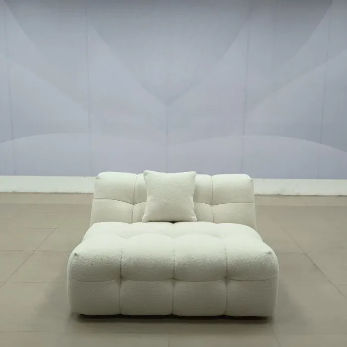 This contemporary modular lounge chair combines bold cubic geometry with exceptional comfort. Upholstered in soft fleece fabric, it features deep quilting and plush cushioning that invite relaxation. Built with a high-density sponge interior and a solid wood frame, it offers both durability and lasting support. Designed as a standalone piece or as part of a modular sofa system, it brings modern elegance and versatility to any interior.