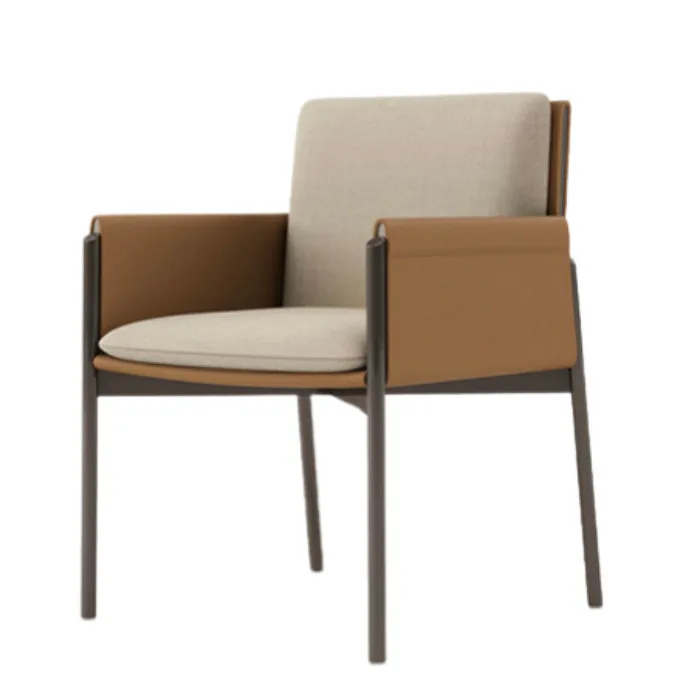 Add a touch of sophistication to your space with this Modern Upholstered Armchair. Featuring a sleek metal frame and soft beige upholstery, this chair combines comfort and contemporary design. The armrests are elegantly wrapped in an olive green fabric, offering both style and functionality. Its durable construction makes it perfect for living rooms, office spaces, or waiting areas. Designed to complement a variety of interiors, this chair is the ideal choice for anyone seeking elegance and comfort in a single piece.