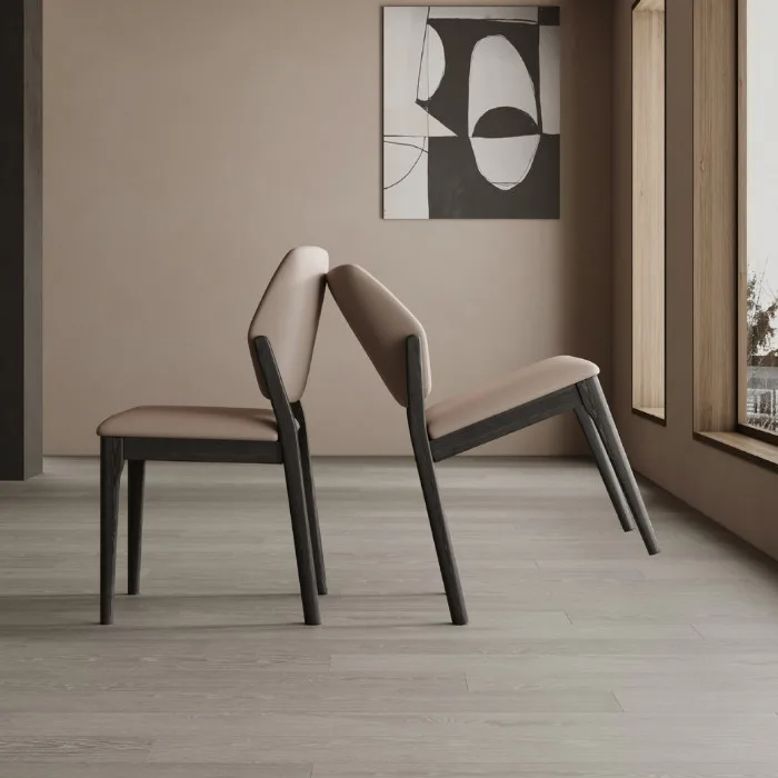 This chair has a modern and minimalist design. It features a beige upholstered seat and backrest, which provide comfort and a sleek appearance. The frame and legs are made of dark wood or a dark-painted material, offering a striking contrast to the lighter upholstery. The slightly curved backrest adds ergonomic support, making it suitable for dining or office spaces.