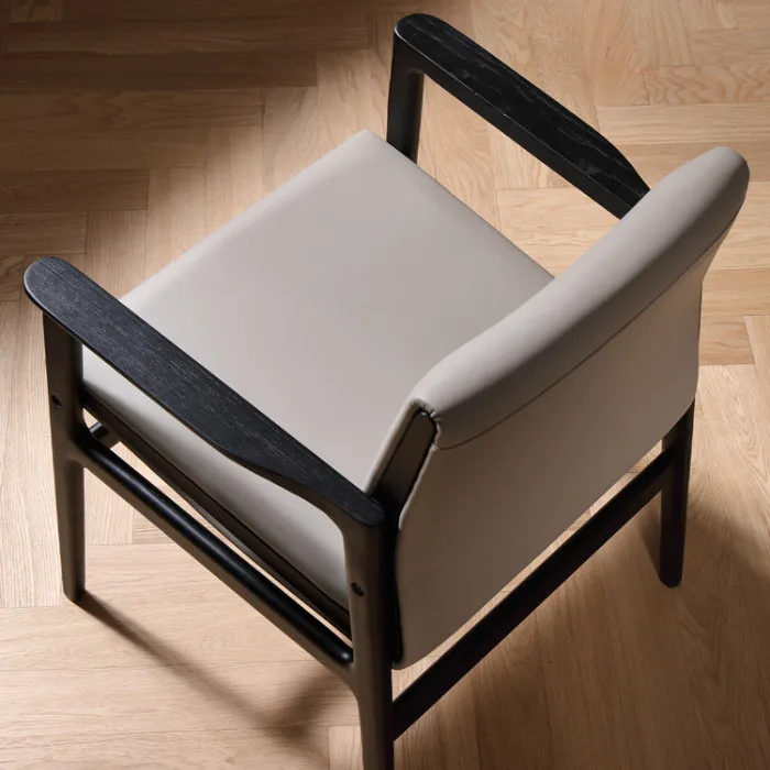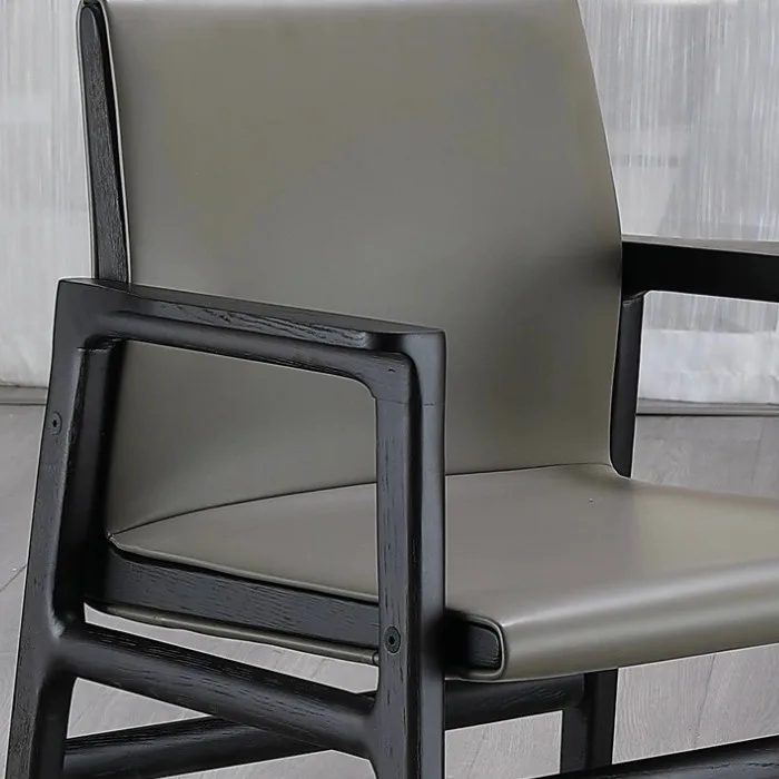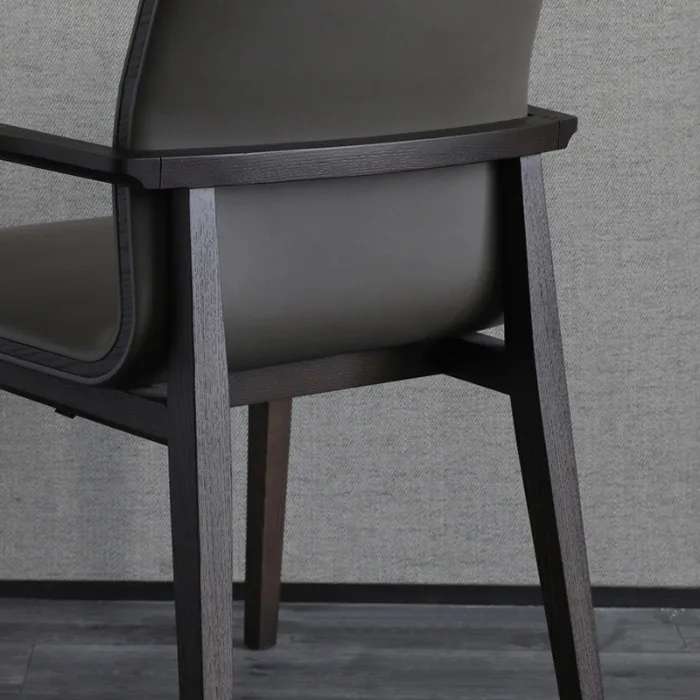 This chair embodies a perfect blend of classic design and contemporary comfort. It features a smooth, brown wooden frame with elegantly straight armrests, creating a refined and timeless look. The seat and backrest are upholstered in a soft, taupe-colored leather or faux leather material, providing a luxurious feel and ergonomic support. The gently curved backrest ensures optimal comfort, making it ideal for use in dining rooms, offices, or reception areas. This versatile chair is a great addition to any space that needs both functionality and sophisticated style.
